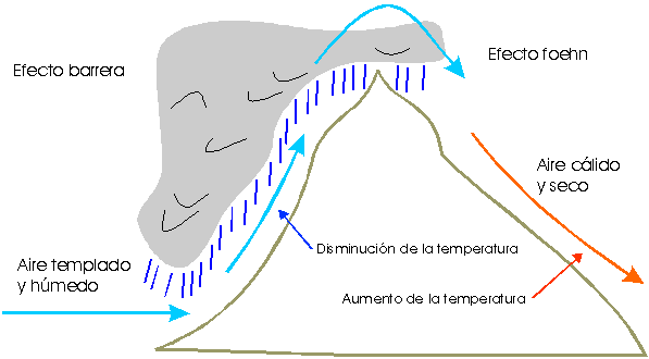 El viento Föehn (también Föhn) toma el nombre, en alemán, de un viento que se da en el norte de los Alpes, aunque en España tenemos unas pocas sucursales del fenómeno. Tal y como describe la imagen, se forma en zonas montañosas cuando una masa de aire cálido y húmedo tiene que ascender rápidamente para salvar esa barrera natural. Así el vapor de agua sufre un enfriamiento, se condensa y viene a precipitarse al otro lado de la montaña dejando a su paso nubes y lluvias.